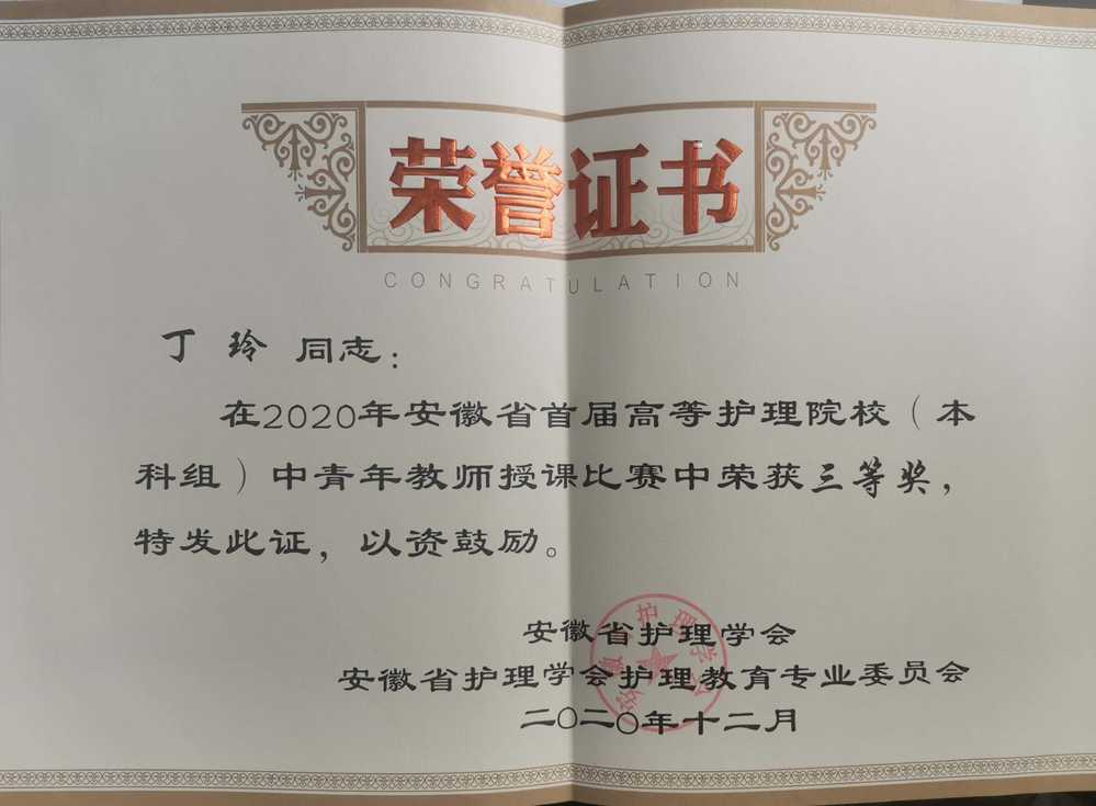 丁玲在2020年安徽省首屆高等護理院校(本科組)中青年教師授課比賽中榮獲三等獎